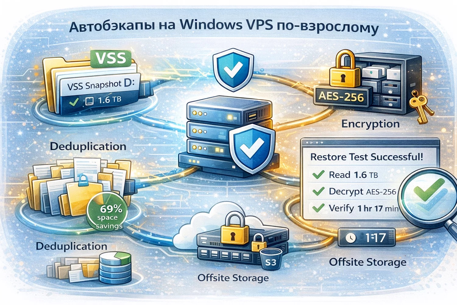 Надёжные бэкапы на Windows VPS – это не один инструмент, а связка практик: VSS даёт консистентный снимок, Windows Server Backup или другой механизм – управляемую копию, дедуп – экономику хранения, шифрование – защиту от утечек, раздельные права – устойчивость к шифровальщикам, а тест восстановления – доказательство, что всё это действительно работает.